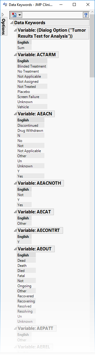 Use this option to open a separate window displaying the reserved keywords that JMP Clinical searches for in study input data set variable values. For example, in reports utilizing the AESEV variable, the value "Severe" will be recognized as greater in severity or intensity than "Moderate", and will be counted and ordered accordingly. You can customize the view by changing columns (and other organization rules) on the Options tab. (Available options are similar to those described in Customizing the Appearance of the Notes Summary.)