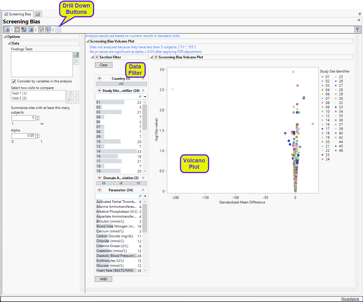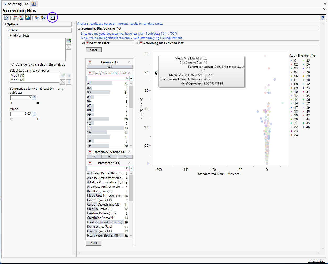 | • | One Volcano Plot. Shows a volcano plot used to find records where findings change significantly between one visit and the next. Screening bias compares all numerical variables. These ranges can be quite different from one another, so to summarize all of the variables in one plot, they are centered around 0 and scaled on the X axis using the standardized mean difference, which is: |
