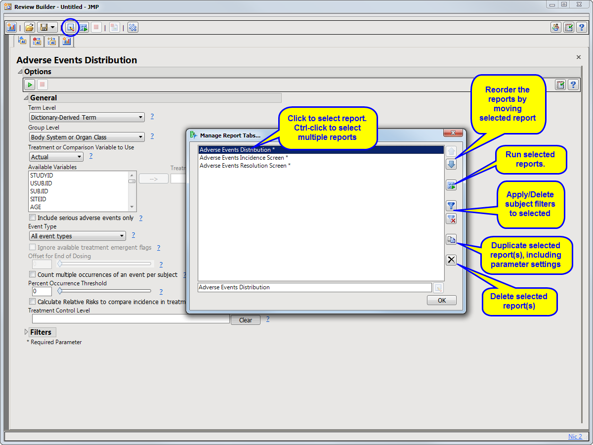 | • | Duplicate reports: Click to add duplicate selected reports and include parameter settings. For example, you might want to add three Findings Time Trends reports, all with changes from baseline setting and showing standard error bars, differing only in the domain being analyzed. |
