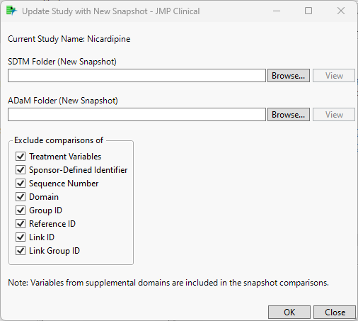 Use the options on this window to specify the folders containing the snapshots, exclude specific comparisons, import SAS transport files, include variables from supplemental domains, and select specific domains.