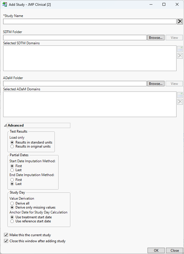 Note: When adding a clinical study and assigning both ADAM and SDTM domains, the ADAM equivalent of each domain is added and the corresponding SDTM data set excluded. For example, if both ADAE and AE are present, then ADAE takes precedence and is included, whereas AE is not included.