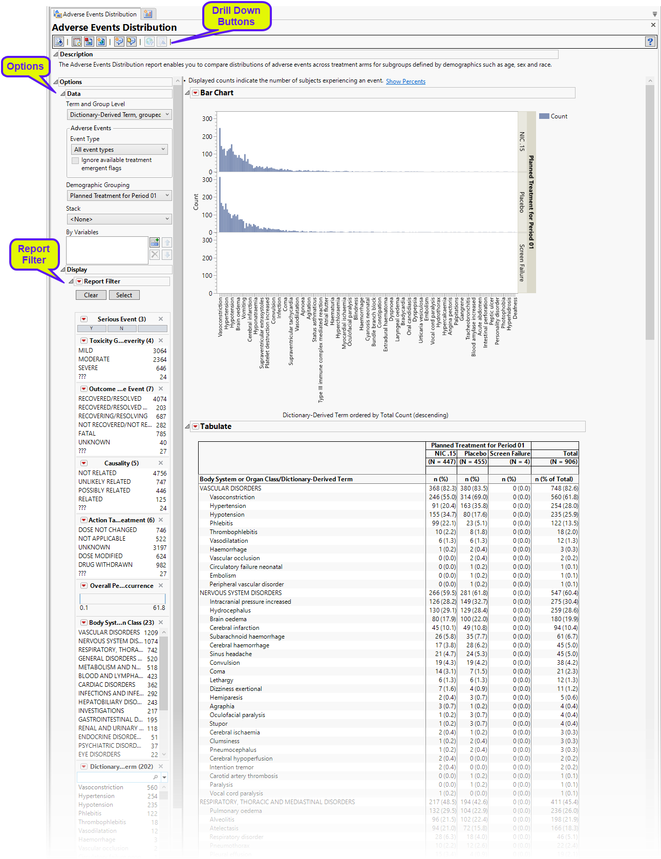 Running Adverse Events Distribution with Nicardipine generates the Report for Adverse Events Distribution as shown below. Differences with other reports are noted throughout this output description.