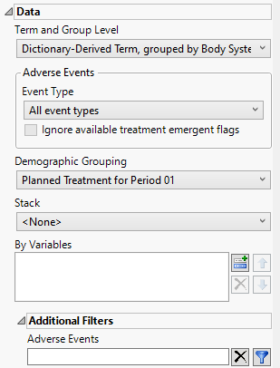 Term and Group Levels are determined by the coding dictionary for the Event or Intervention domain of interest, typically these levels follow the MedDRA dictionary. Use this widget to indicate how each adverse event is named and the level at which the event is considered. For example, selecting Reported Term for the Adverse Event, grouped by Body System or Organ Class as the Term and Group Level reports the event specified by the actual event term as reported in the AE domain on the affected organ or body system.