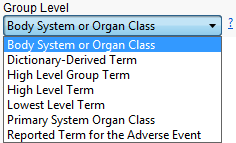 | 8 | Select the group level corresponding to the adverse event or intervention terms that you want to use from the drop-down menu. |