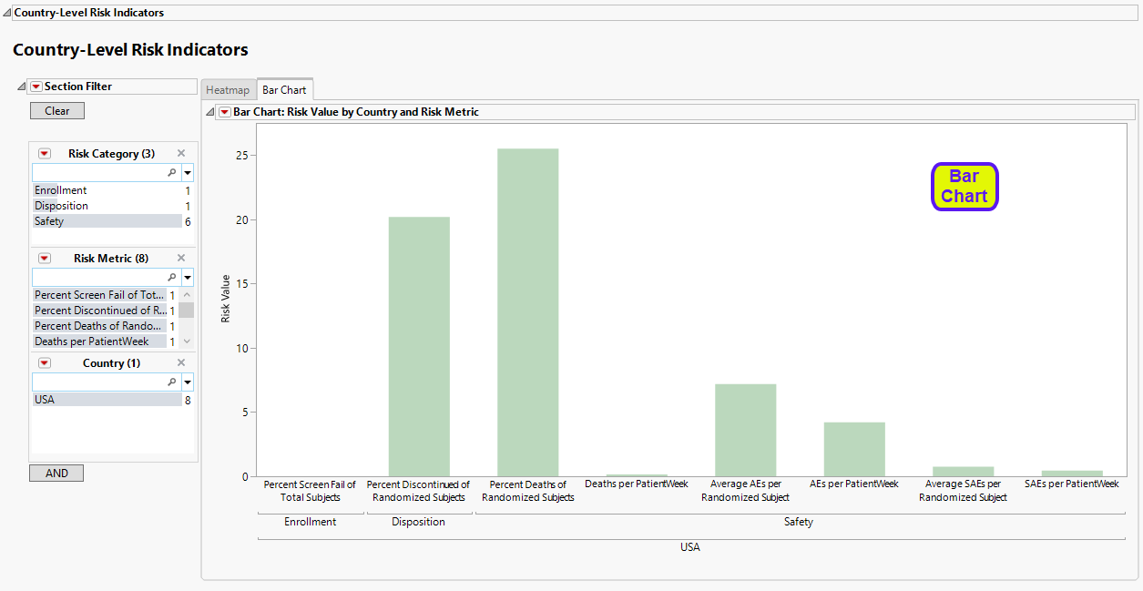| • | A bar chart showing the risk value for each indicator across the sites. The data in the following bar chart were filtered to site 42 only. |