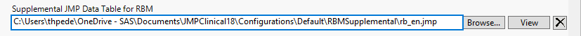 By default, JMP Clinical looks first in the RBMSupplemental subfolder found in the user folder (typically located in the C:\Users\username\OneDrive - SAS\Documents\JMPClinical18\Configurations\Default\RBMSupplemental\rb_en.jmp directory), although supplemental data sets can be stored anywhere.