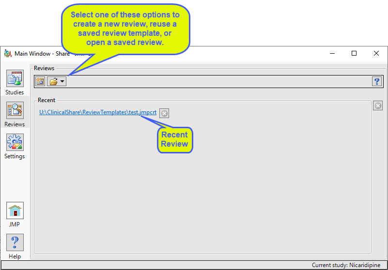 The Reviews tab (shown below) enables you to create a new review of the selected study, open an existing review, or use a template generated previously for another study to generate a review for the current study.