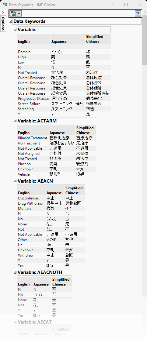 | 8 | Click View Data Keywords to open the Data Keywords window showing the English, Japanese, and Chinese translations fo specific keywords used by JMP Clinical. |