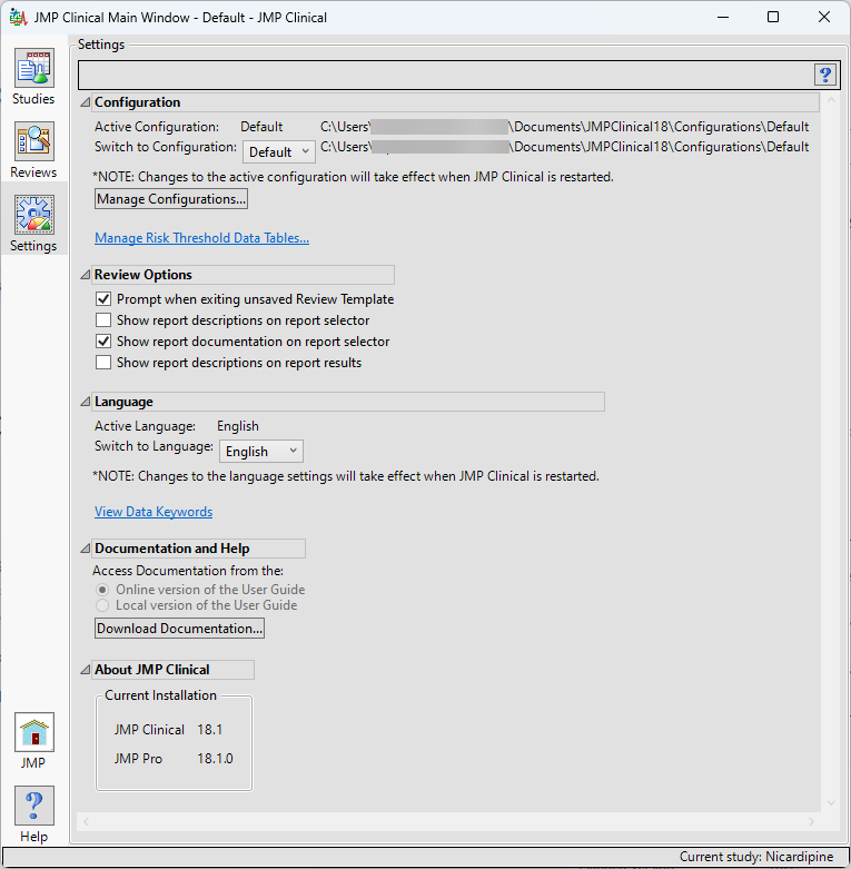 This section displays the current configuration, the paths to the user root directory, system preferences, and user documentation and other files used and created by JMP Clinical. An option for viewing the paths to all relevant directories can be selected.