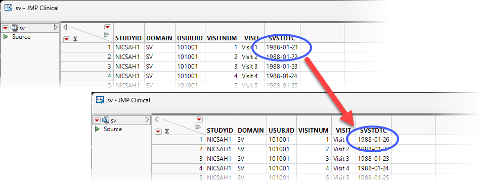 In the following example, the Nicardipine study data files were copied into a new Study folder called NicardipineProblemVisit and the new study was added as described in Add Study.... The SV domain was opened and the date of the first study visit was changed from 1988-1-21 to 1988-1-26, as shown below.