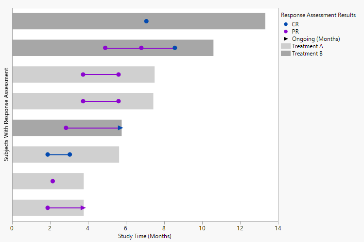 A swimmer plot is a graphical way of showing a subject’s response to a treatment over time.