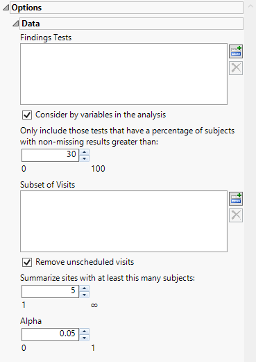 By default, findings analyses are conducted assuming that sufficient numbers of subjects have participated to make the results statistically significant. If the percentage of subjects who had the test at a certain visit and time point is low, then the test is removed from the analysis for that visit and time point. The default value for Only include those tests that have a percentage of subjects with non-missing results greater than: is 30%, so if only 20% of the total subjects at Visit x had a certain test performed, then that test at Visit x is removed from the analysis.