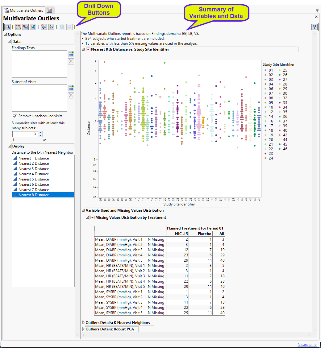 This report attempts to use as much data as possible and takes all findings test codes by visit number for each subject. Of course, doing so can lead to missing data particularly for studies that do not appear to have a fixed number of visits or with lots of dropouts. The Explore Outliers platform's K Nearest Neighbors method uses missing value imputation on variables with fewer than 5% missing values by default, so of the subjects that have fewer than 5% missing values for one of those variables have those values imputed. Scores are computed for those subjects with either complete data or imputed data. Because outlier distance cannot be calculated with lots of missing data present, variables with more than 5% missing values are not considered. Scores are computed for those subjects with either complete data or imputed data. Refer to the JMP Help for Robust PCA Outliers for information on how that method handles missing values.