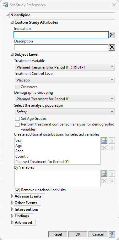 Note: JMP Clinical automatically tries to assign default values for each of the subject level preferences based on flags found in the ADSL, ADDM, or DM (and optionally SUPPDM) data sets as well as prior selections. Use the individual widgets to modify the selections.