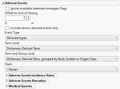 Check the Include serious adverse events only check box to include only serious adverse events in the analysis. Serious events are identified by a “Y” value in the expected AESER variable in AE or ADAE.
