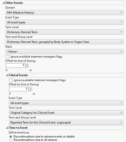 Term and Group Levels are determined by the coding dictionary for the Event or Intervention domain of interest, typically these levels follow the MedDRA dictionary. You must indicate how each adverse event is named and the level at which the event is considered. For example, selecting Reported Term for the Adverse Event, grouped by Body System or Organ Class reports the event specified by the actual event term as reported in the AE domain on the affected organ or body system.