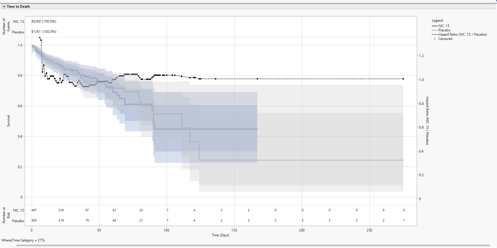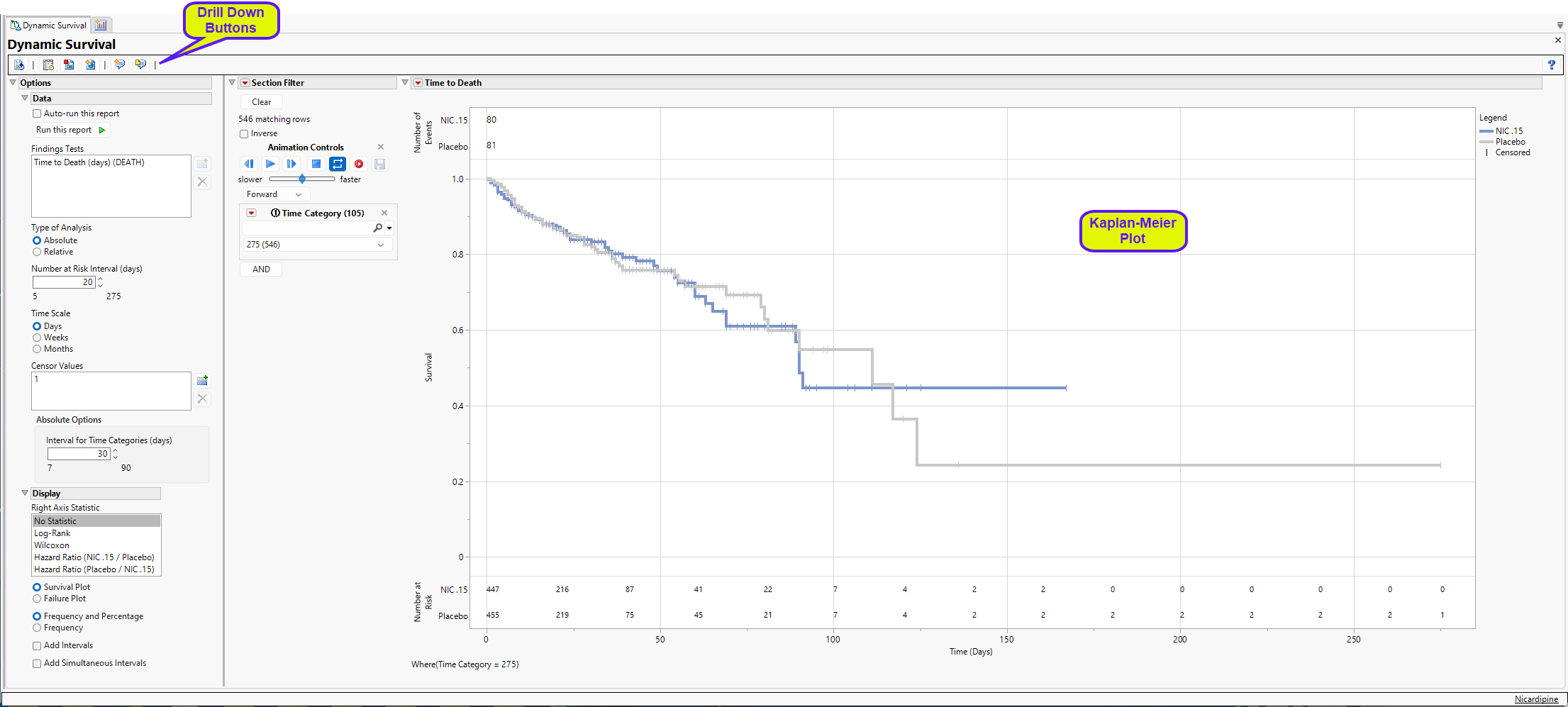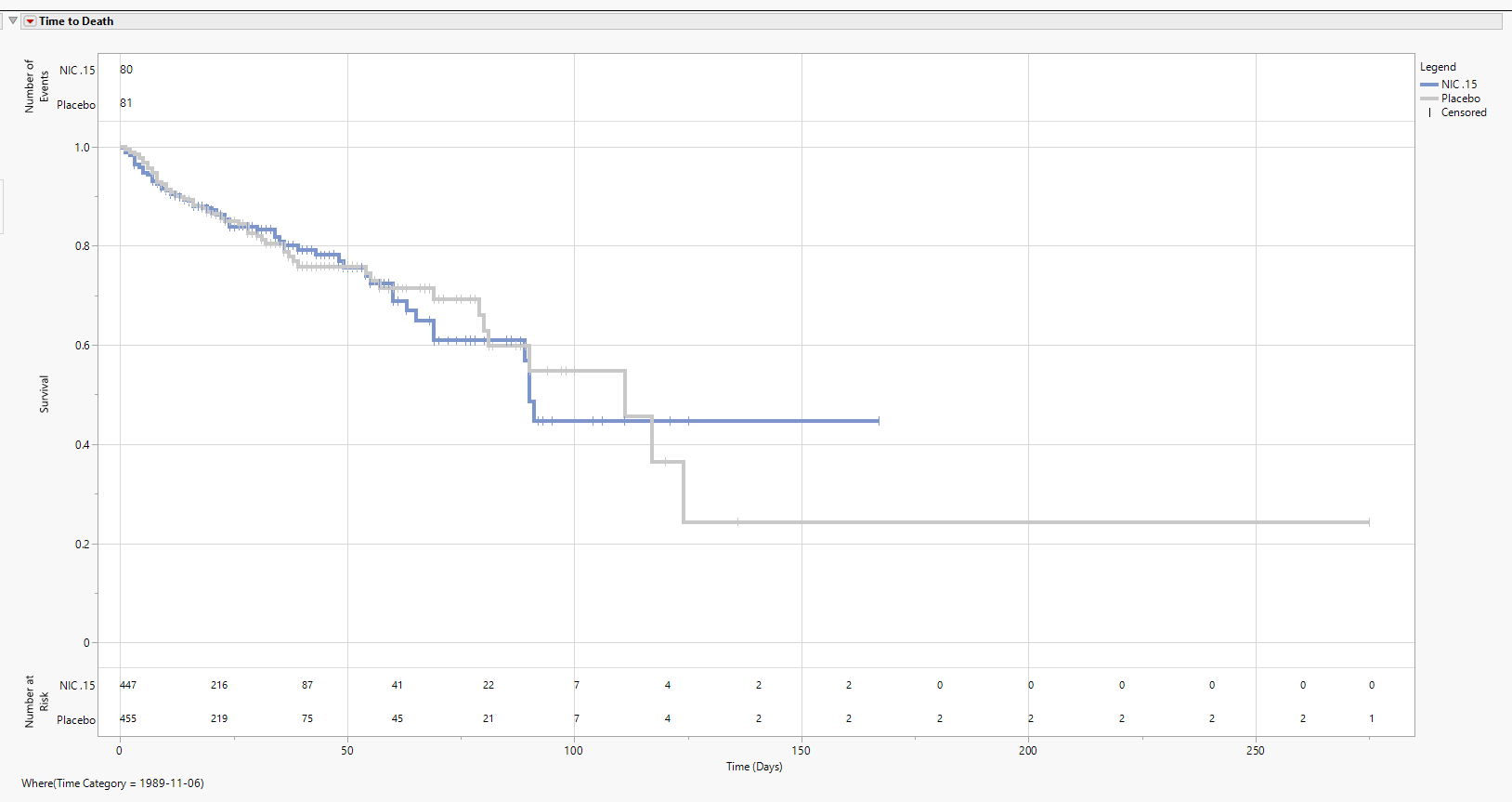 The figure below is an Absolute analysis of the Nicardipine Time to Death endpoint from ADTTE. Censored observations are represented by the vertical pipe symbols. At the top of the figure,