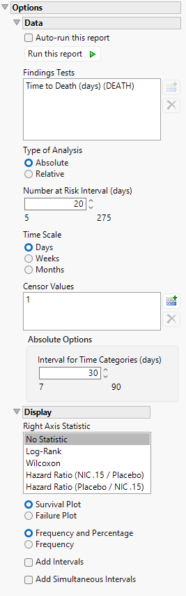 This report uses the JMP Survival and Fit Proportional Hazards platforms to analyze a single endpoint from the ADTTE domain. Essentially, the Survival and Fit Proportional Hazards platforms analyze survival endpoints separately for distinct time categories that are produced according to the type of analysis that is requested, Absolute or Relative (default).