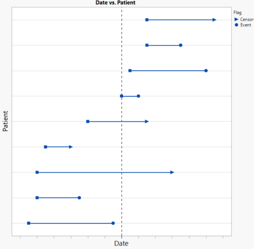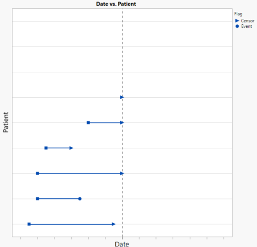 Suppose there was interest in conducting an interim analysis at a date indicated by the dashed horizonal reference line. For this analysis, patients whose follow-up extends beyond this reference date would be censored at this date (see below). This interim analysis conducted using this data would include 6 patients, only one of whom had an event prior to the reference date.