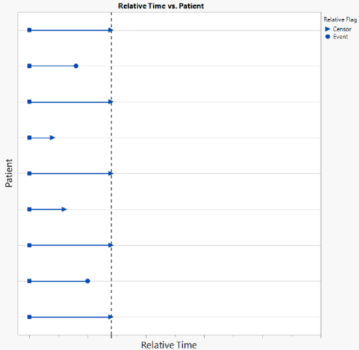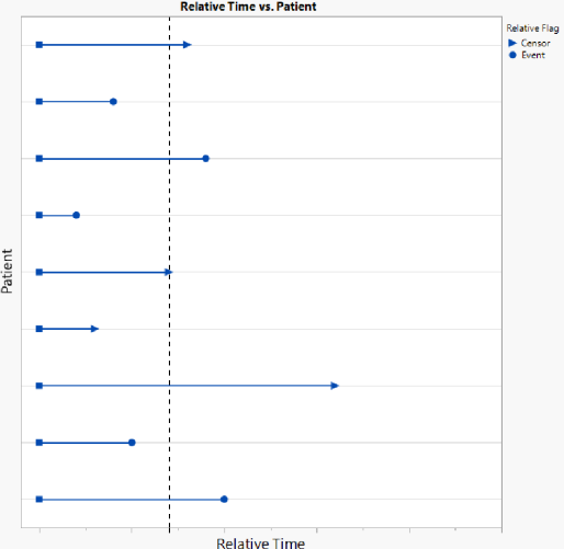 In contrast to the Absolute analysis described in Figure 2, the Relative analysis (see below) considers time within each patient relative to their start dates. Therefore, all patients start at time 0 (coinciding with ADTTE.STARTDT) and the number of days (most generally) to reach the event/censor date will coincide with ADTTE.ADT. In a manner similar to the Absolute analysis, suppose there was interest in conducting an analysis at a Relative time indicated by the dashed horizonal reference line.