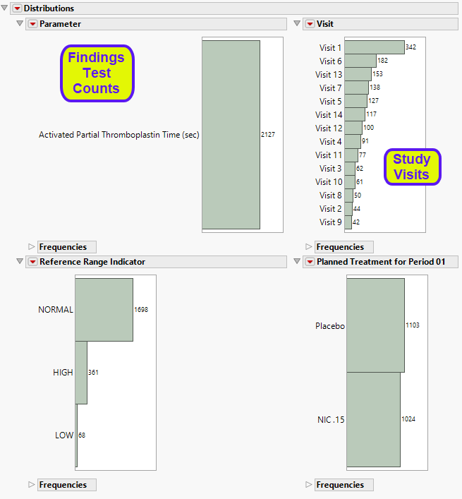 These display counts and histograms of relevant variables in the Findings data set. A distribution of subjects on the Actual, Planned, or Specified Treatment is shown as well as other findings variables (if present). Findings variables displayed can include the Reference Range Indicator (xxNRIND), the Visit and Time Points at which findings were taken (VISIT and xxTPT), and Baseline Flag (xxBLFL). Note: JMP Clinical supports the conversion of the ANRIND variable to xxNRIND.