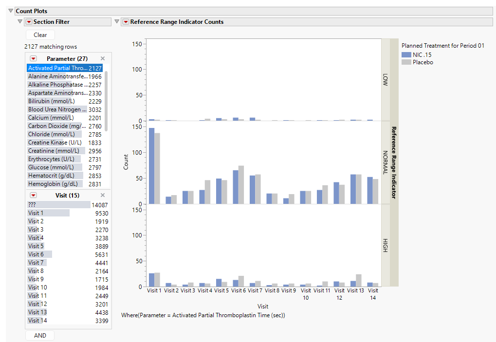 These plots show the distribution of measurements across categories of the Reference Range Indicator variable (xxNRIND). For example, you can see how many laboratory measurements for a given test were categorized as HIGH, NORMAL, or LOW based on values of the Reference Range Upper Limit and Reference Range Lower Limit (LBSTNRLO and LBSTNRHI, respectively). The graph contains bars representing the counts within each category for each treatment across Study Visits (VISIT or VISITNUM).