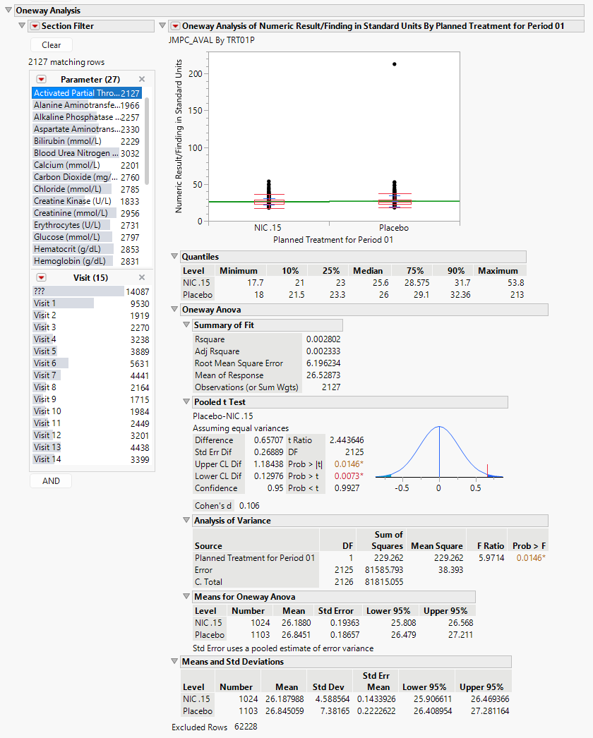 Each analysis represents an Analysis of Variance (ANOVA) for each numeric Findings test (tests that contain nonmissing values for xxSTRESN) to compare measurements taken across different treatment arms. You can click the Oneway ANOVA outline box below each plot to show the statistical results of the analysis.