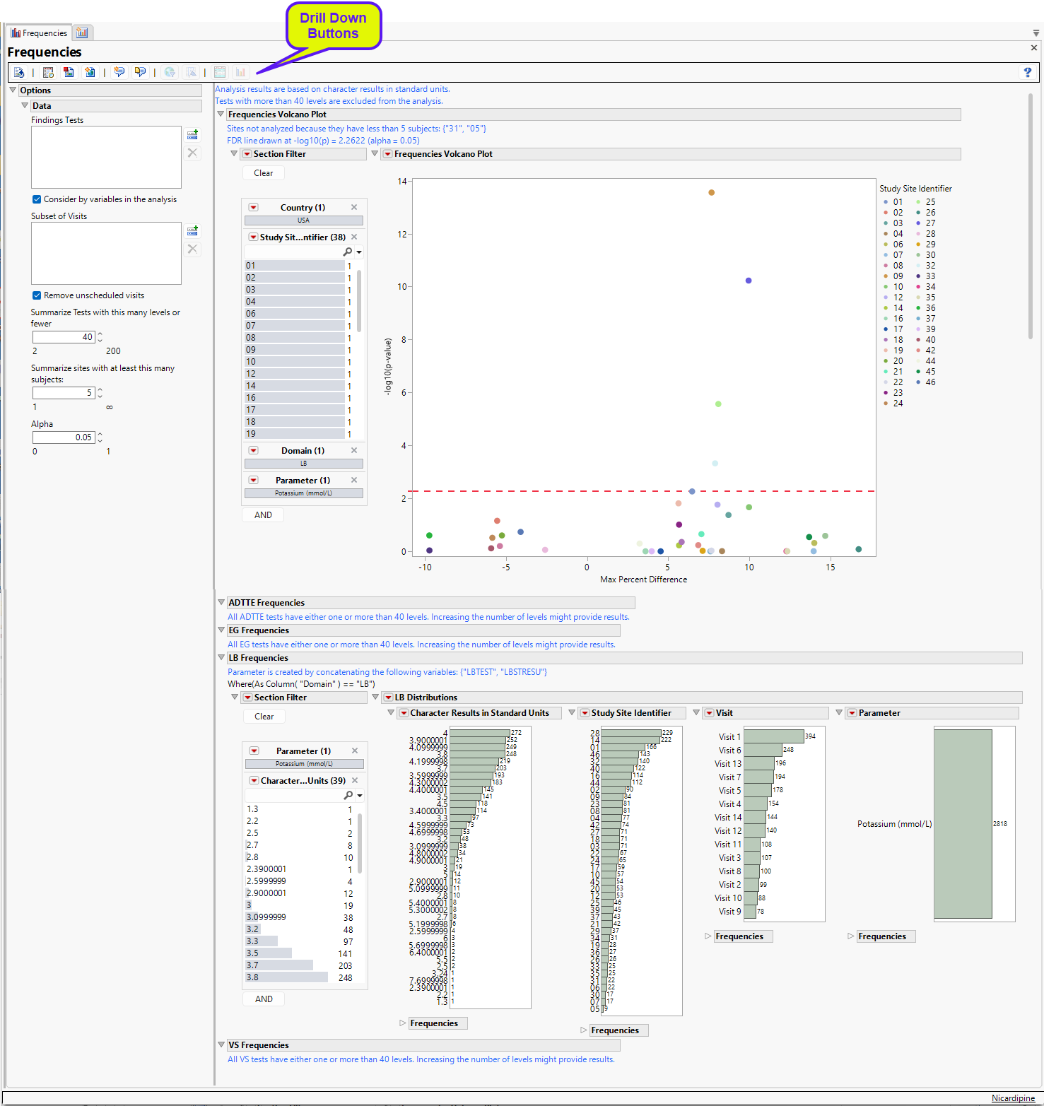 Note: Running the Nicardipine sample data with default settings does not generate a report. In this example, set the Summarize tests with this many levels or fewer: option was set to 40.