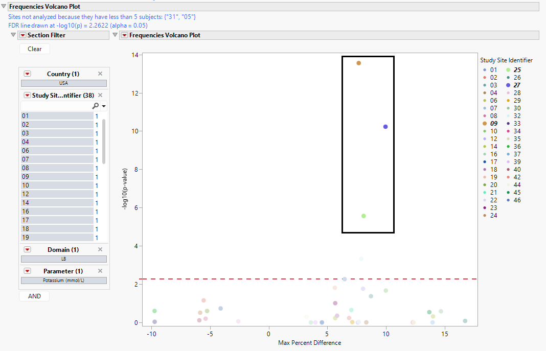 The volcano plot is used to determine the deviation of the proportion of findings frequencies at each site with the overall proportions for the findings across the whole study. Each “dot” represents a single Findings test for a specific site, which is compared to a reference (all other sites).The X axis represents the maximum difference in proportions between each value of the Findings test between the site and the reference set (all other sites).
