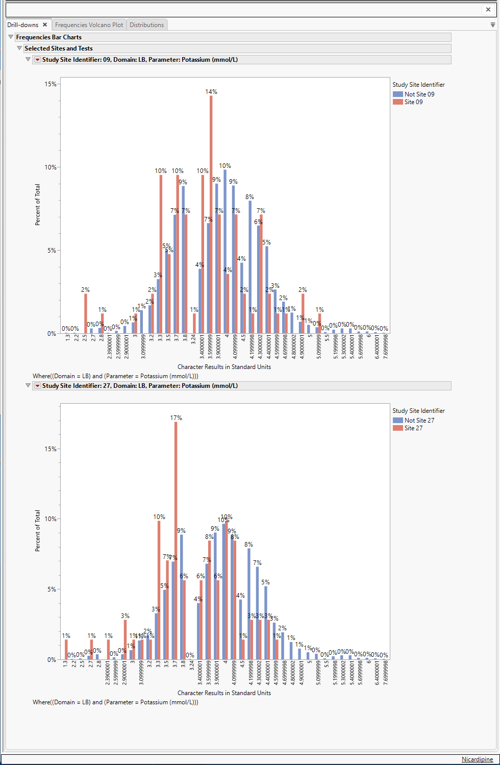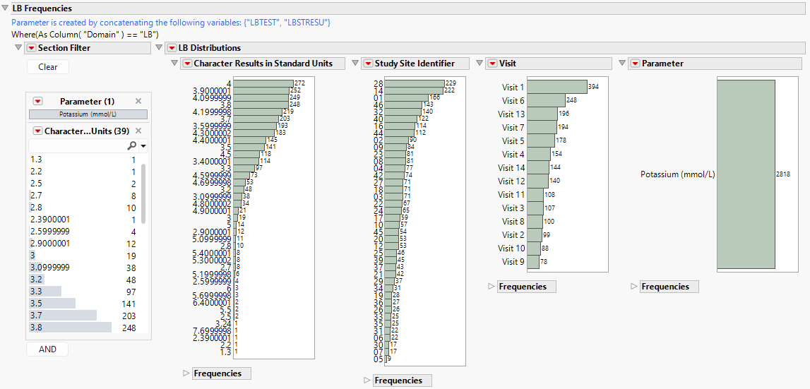 | • | Distributions: Displays histograms showing distributions of laboratory test findings across study sites, tests, and visit numbers, and tests. |