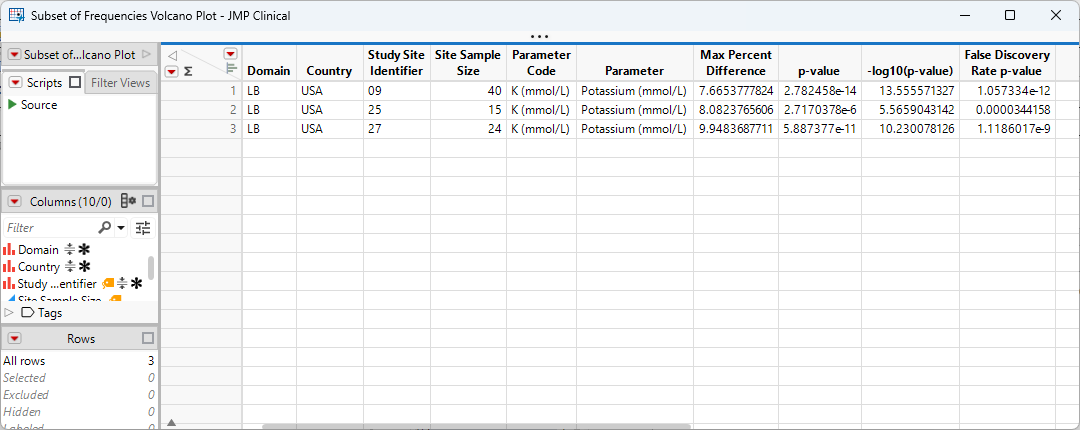 | • | Show Sites: Shows the rows of the data table for the selected points from the volcano plot. Clicking opens the following table: |