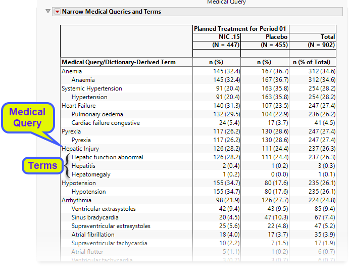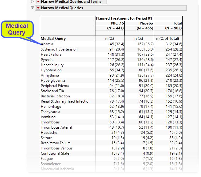 The Medical Queries and Terms table lists the counts (and percentages) by treatment arm for each medical query and the specific preferred terms associated with each query.