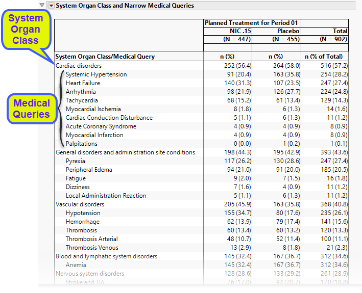The System Organ Class and Medical Queries table organizes the results by system organ class and lists the counts (and percentages) by treatment arm for each system organ class and further by their associated medical queries.