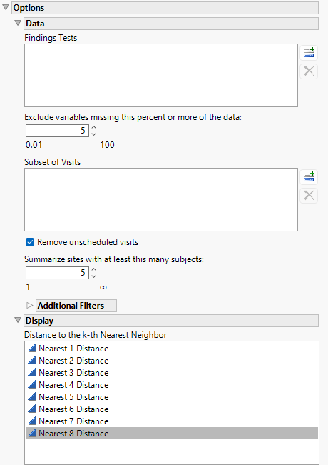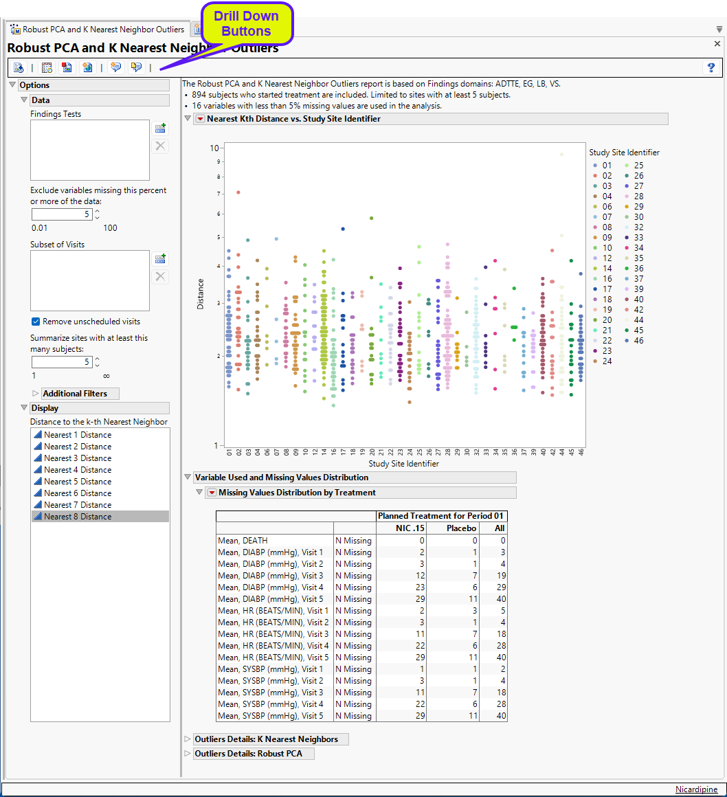 This report attempts to use as much data as possible and takes all findings test codes by visit number for each subject. Of course, doing so can lead to missing data particularly for studies that do not appear to have a fixed number of visits or with lots of dropouts. The Explore Outliers platform's K Nearest Neighbors method uses missing value imputation on variables with fewer than 5% missing values by default, so of the subjects that have fewer than 5% missing values for one of those variables have those values imputed. Scores are computed for those subjects with either complete data or imputed data. Because outlier distance cannot be calculated with lots of missing data present, variables with more than 5% missing values are not considered. Scores are computed for those subjects with either complete data or imputed data. Refer to the JMP Help for Robust PCA Outliers for information on how that method handles missing values.