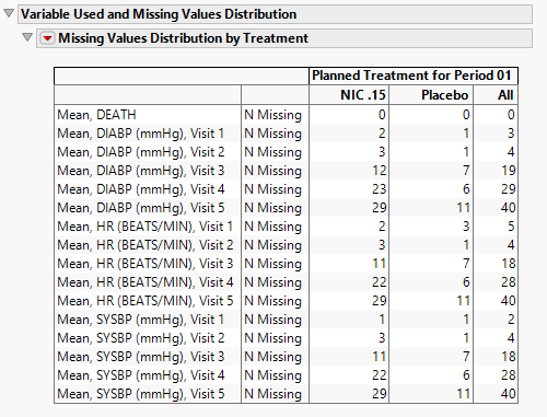 For the Nicardipine example shown here, 12 out of 510 variables from the LB, EG, VS domains have missing data rates below 5% and are kept. This information is described at the top of the output.