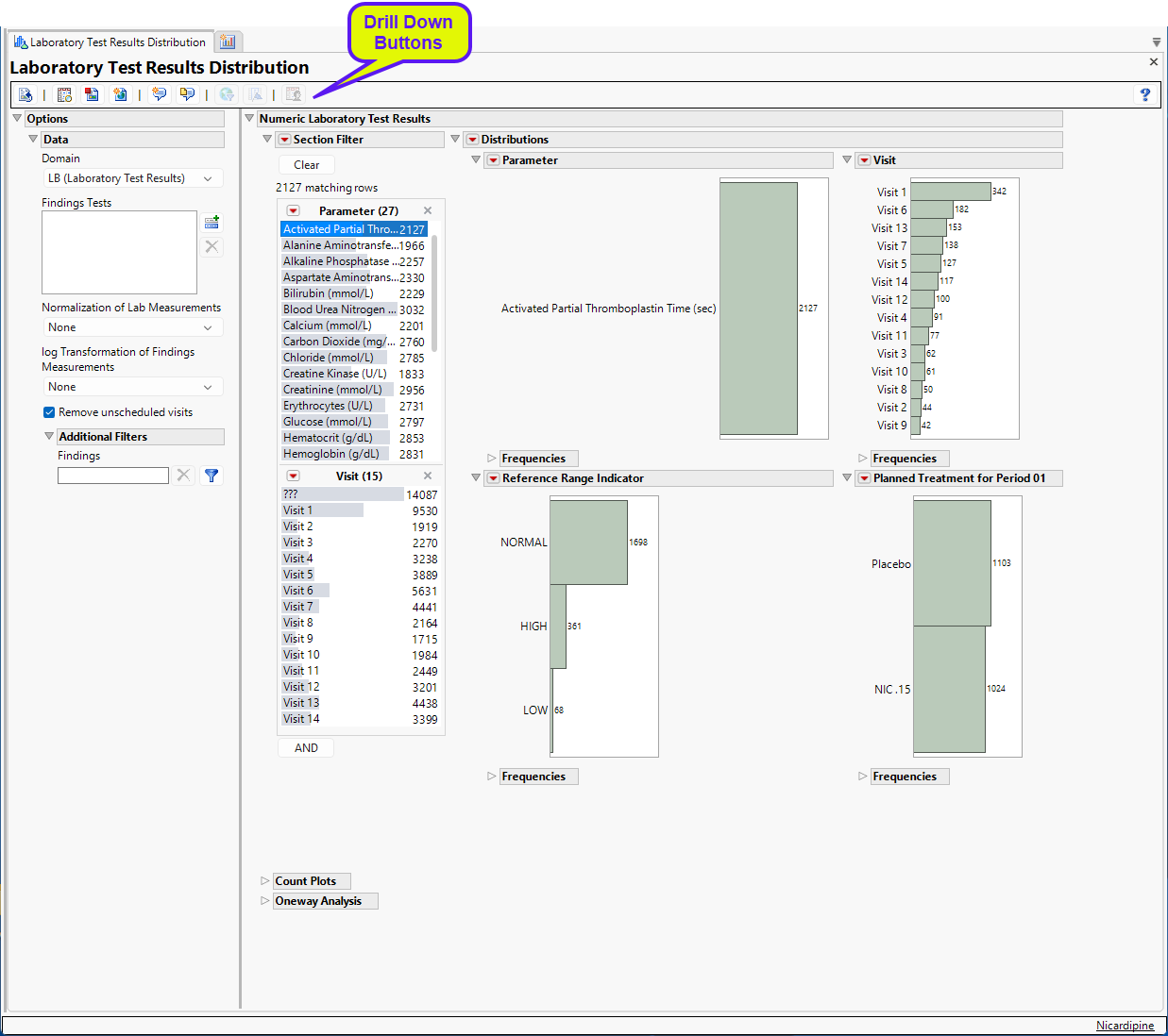 Running Findings Distribution for Nicardipine using default settings generates the Report shown below.
