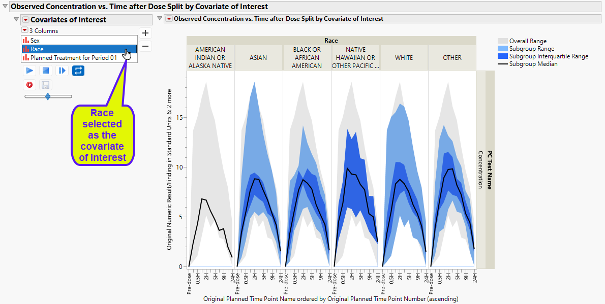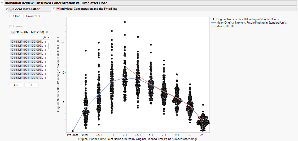 The Local Data Filter can be used to subset to an individual patient to view their particular pk concentration profile. This view makes it possible to assess the individual’s pharmacokinetics in the context of the entire treatment arm as well as across all patients.