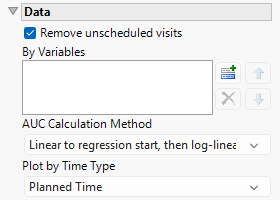 Use this widget to specify the method used to calculate the area under the curve (AUC). Options include Linear to regression start, then log-linear, Linear for the whole curve, Linear ascending, log-linear descending, and Log-linear for the whole curve, See AUC Calculation Method for more details.