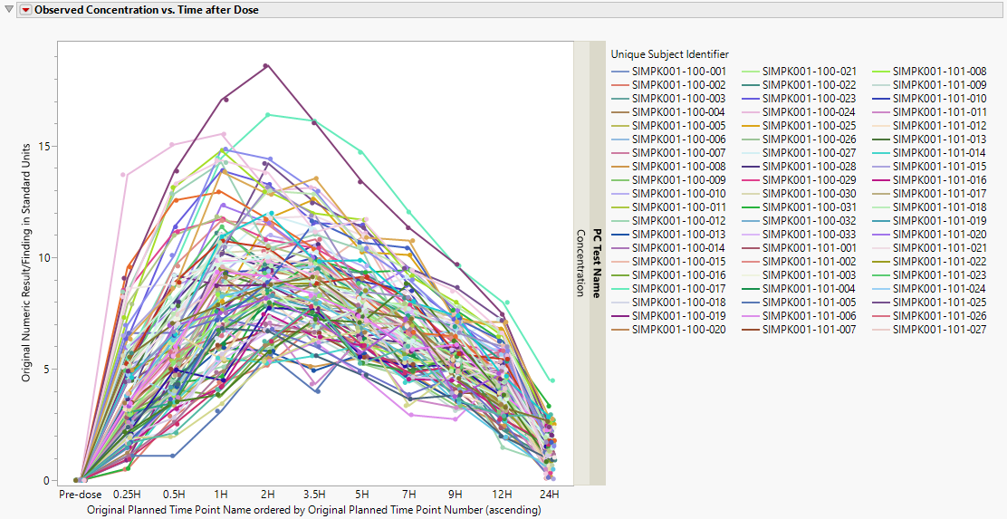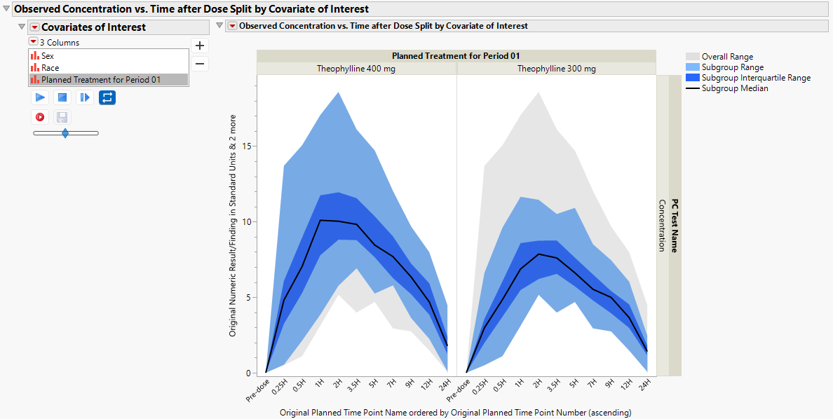 The standard Nicardipine sample study typically used in this User Guide does not have concentration data available in a PC domain and is suitable for use with this report. A simulated clinical trial data set, based on the Theophylline data that were described in Pinheiro & Bates (1995), is now included in the JMP Clinical Sample Data folder. Theophylline is a bronchodilator used to treat the symptoms of asthma and other lung diseases.
