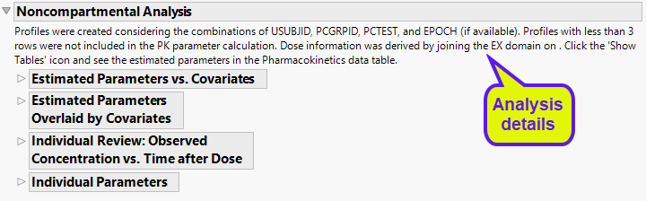 The JMP Fit Curve platform provides one- and two-compartment models for PK analysis and a Non-compartmental analysis (NCA) using data available from the CDISC pharmacokinetics concentrations (PC) domain. Further, this report produces PK profiles that enable the user to view the data of each individual patient in the context of summary statistics derived across groups of patients