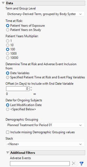 Term and Group Levels are determined by the coding dictionary for the Event or Intervention domain of interest, typically these levels follow the MedDRA dictionary. You must indicate how each adverse event is named and the level at which the event is considered. For example, selecting Reported Term and Body System or Organ Class as the Term and Group Level, respectively, reports the event specified by the actual event term as reported in the AE domain on the affected organ or body system.