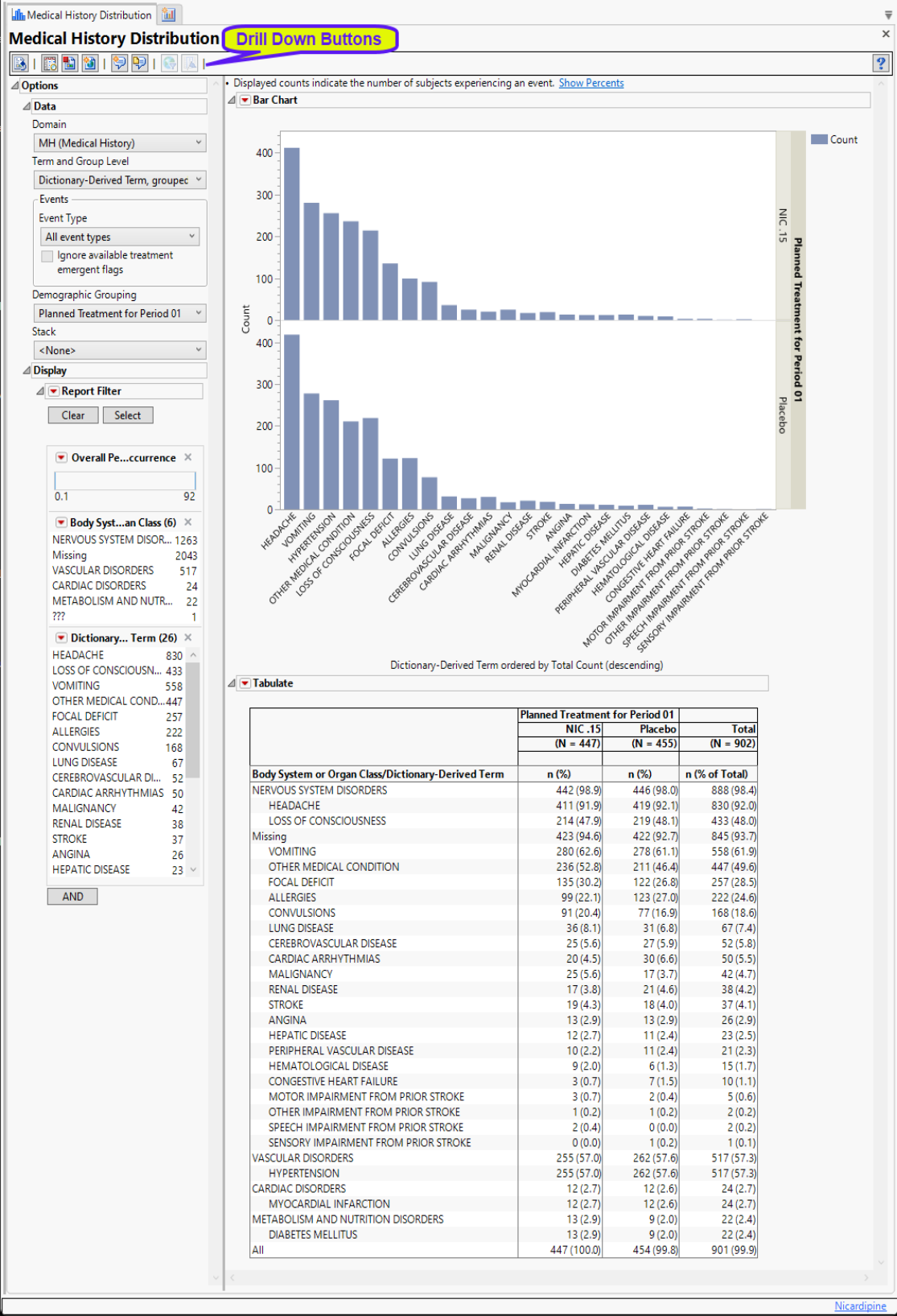 Running this report for Nicardipine using default settings for medical history (MH) generates the Report shown below.