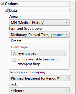 Term and Group Levels are determined by the coding dictionary for the Event or Intervention domain of interest, typically these levels follow the MedDRA dictionary. Use this widget to indicate how each adverse event is named and the level at which the event is considered. For example, selecting Reported Term for the Adverse Event, grouped by Body System or Organ Class as theTerm and Group Level reports the event specified by the actual event term as reported in the AE domain on the affected organ or body system.