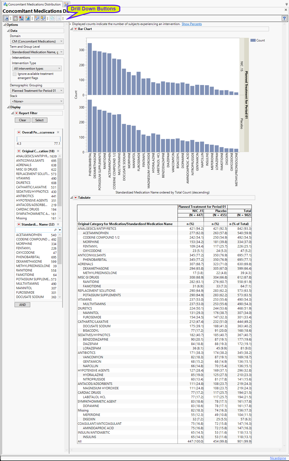 Running this report for Nicardipine using default settings generates the report shown below.