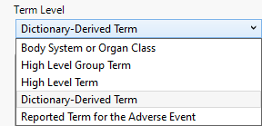 Use this option to specify which level of terms (for example, adverse event, intervention, or MedDRA) to use as categories.
