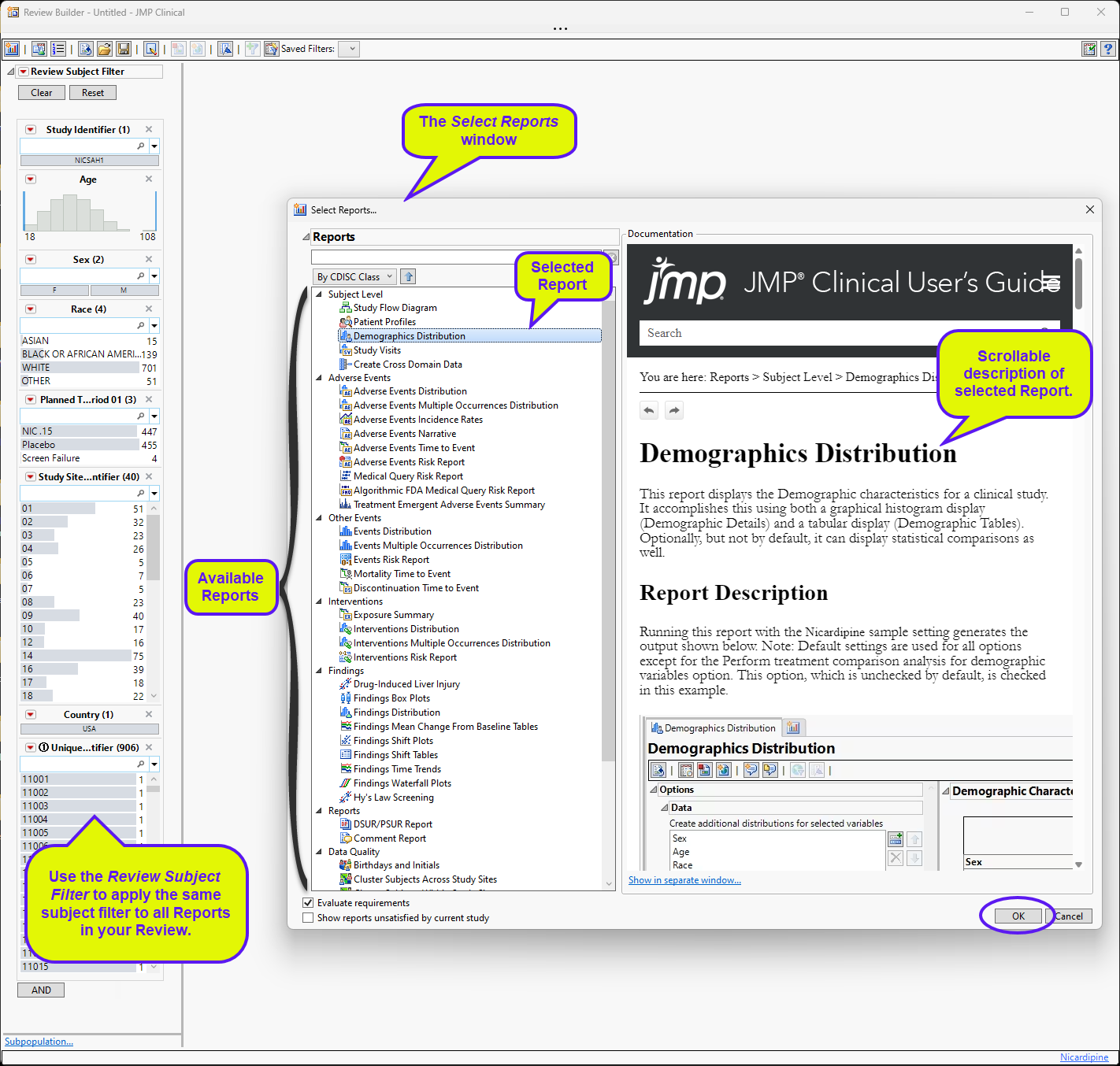 Create Subject Filter: Click to generate a subject-specific filter that can be applied to all subsequent reports run for this review. Only those patients specified by the filter are carried through the analyses.