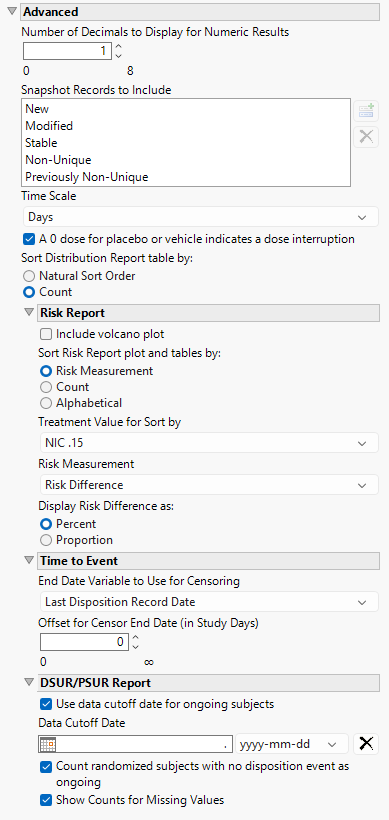 Use the End Date Variable to Use for Censoring option for specifying the end date for censoring. Options include the reference end date, date of the last treatment, the date on which the subject left the study or the date of the last disposition record (selected by default).