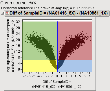A volcano plot is useful for identifying events that differ significantly between two groups of experimental subjects. The name volcano plot comes from its resemblance to an idealized image of a pyroclastic eruption with the most significant points at the top as spewed pieces of molten lava. An example of a volcano plot derived using real data is shown below. The gene expression data used to generate this plot comes from two cell lines: one possessing five copies of the X chromosome (NA01416_5X, group 1) and one possessing one copy of the X chromosome (NA10851_1X, group 2). Group 2 is the control group.