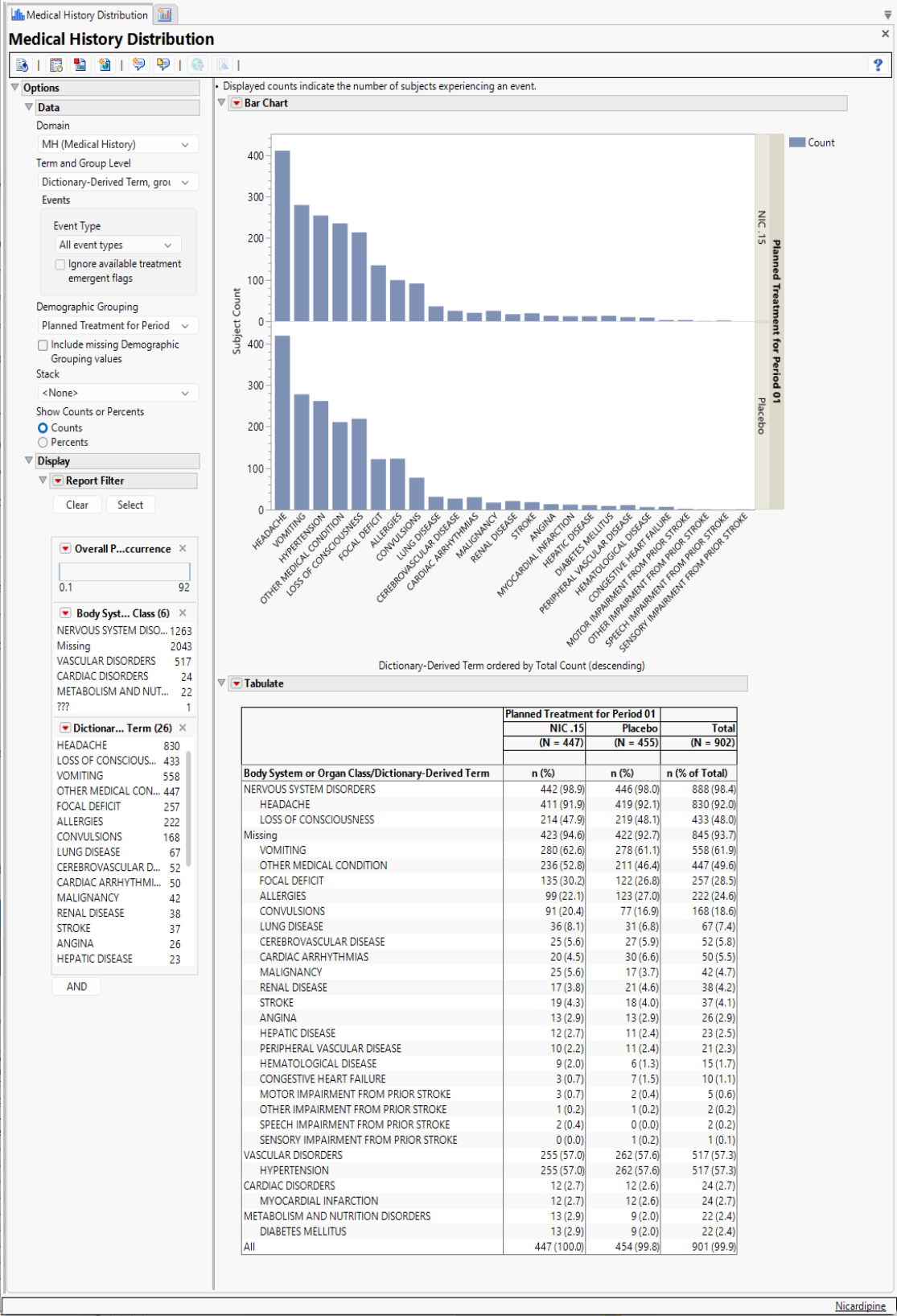 Running this report for Nicardipine using default settings for medical history (MH) generates the Report shown below.