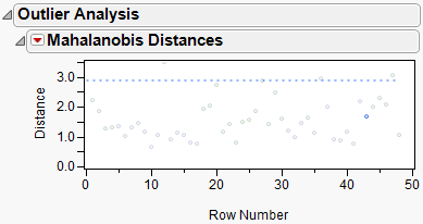 In the Mahalanobis Distances plot shown below, the distance of each row number is plotted. Those outlier points residing above the dotted line correspond to those rows that warrant the most attention due to their significant distance from the mean center of all other observations.